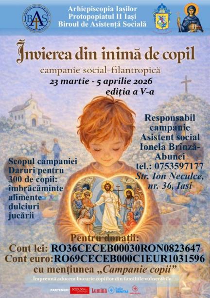 Fundamentată pe valorile creștine ale solidarității, compasiunii și responsabilității comunitare, campania are ca scop sprijinirea a 300 de copii proveniți din familii defavorizate din parohiile arondate Protopopiatului II Iași, oferindu-le bucurie cu prilejul sărbătorilor pascale și contribuind la îmbunătățirea condițiilor lor de viață.